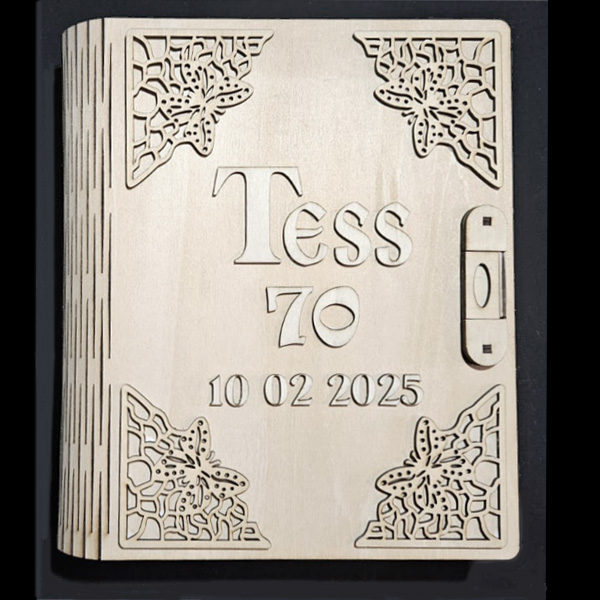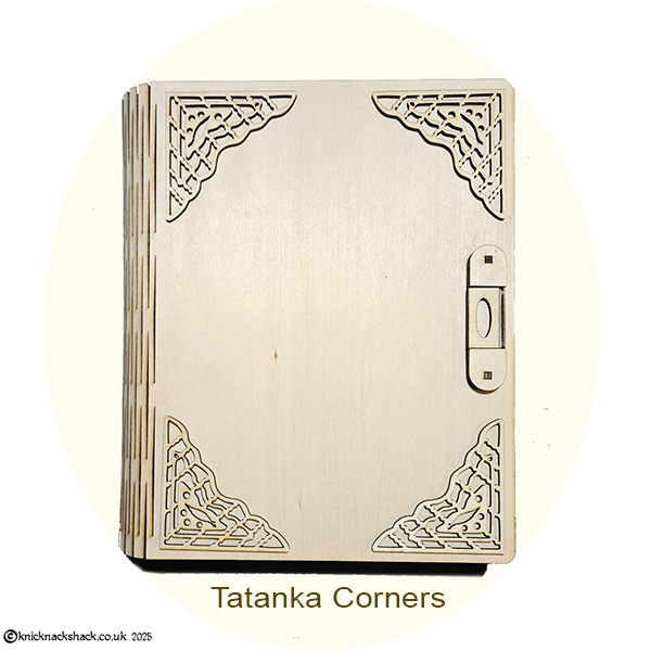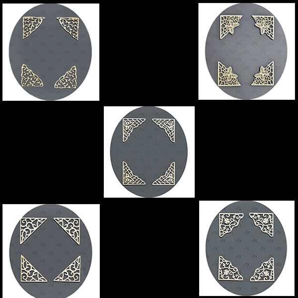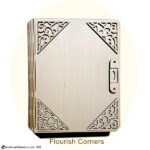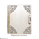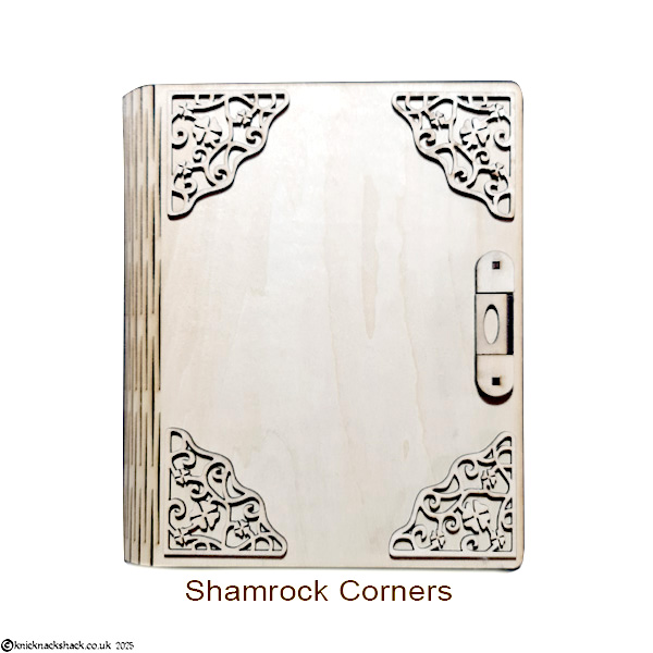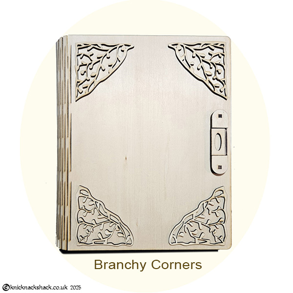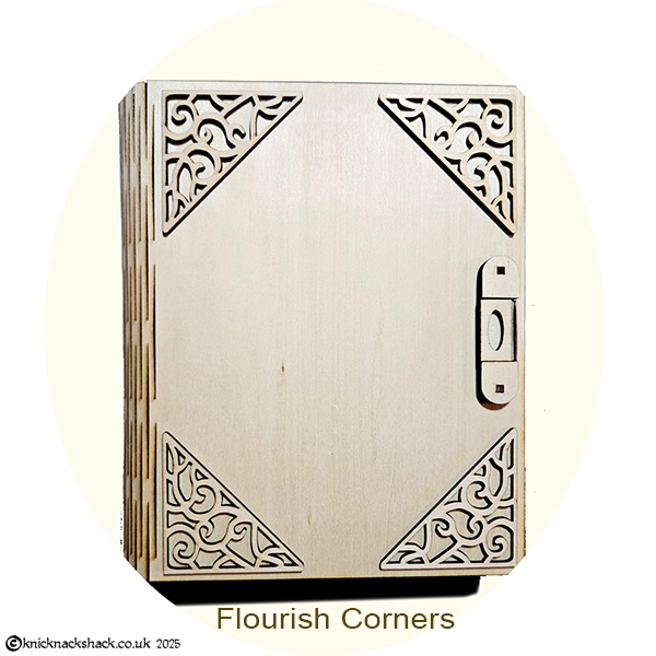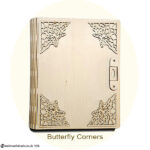 This exquisitely crafted wooden book is more than meets the eye. Precision laser-cut from 3mm wood, it features a flexible “living hinge” spine and a working clasp that opens to unveil a hidden 5.3cm-deep compartment—a treasure box tucked inside a storybook. Whether for heartfelt gifts, cherished mementos, or magical surprises, this keepsake is made for those truly special souls in your world. Add a Touch of Elegance to Your Book – Choose one of our exquisite corner sets then leave the rest to us! We’ll carefully affix the corners to your book before dispatch, ensuring it arrives with a beautifully finished flourish.